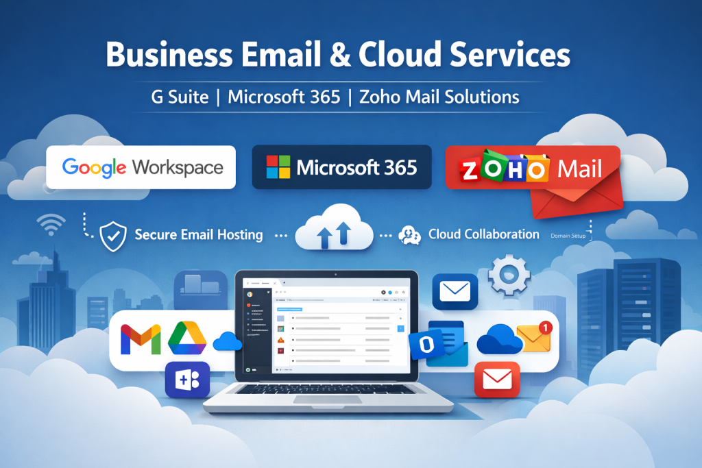 We provide complete business email and cloud solutions including Google Workspace (G Suite) setup services in Noida, Microsoft Cloud 365 services in Noida, and Zoho Mail setup services in Noida with secure domain configuration and professional email creation. Our team ensures seamless cloud integration, data security, and smooth collaboration tools to enhance business communication and productivity.